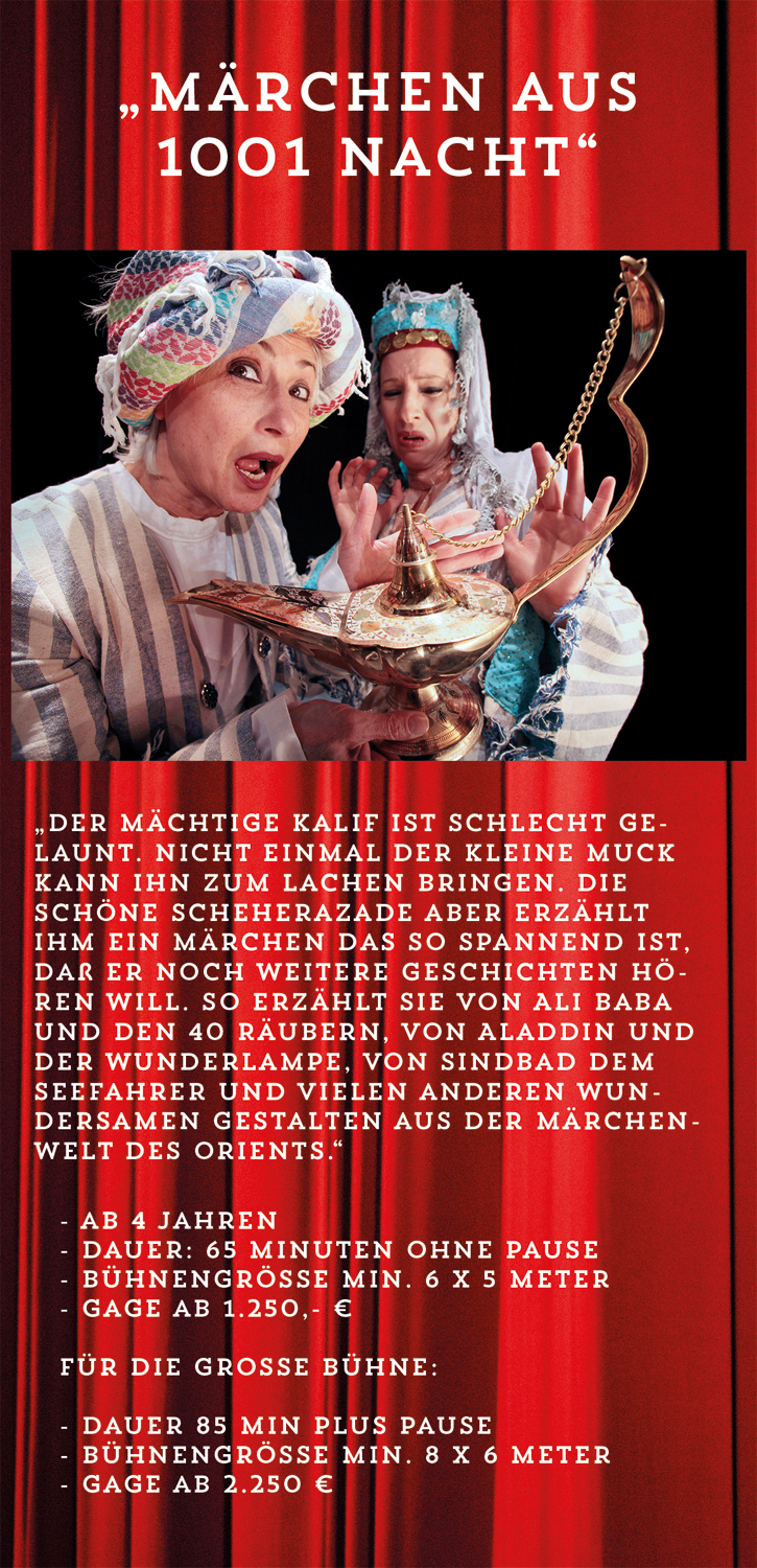 Das Theater Wundertüte inszeniert seit 1988 Musik- und Theaterstücke für Kinder. Nach der Kinderliederrevue und der aktuellen Produktion „Grimms Märchen - leicht gekürzt“ gibt es nun eine neue Produktion: „Märchen aus 1001 Nacht“.